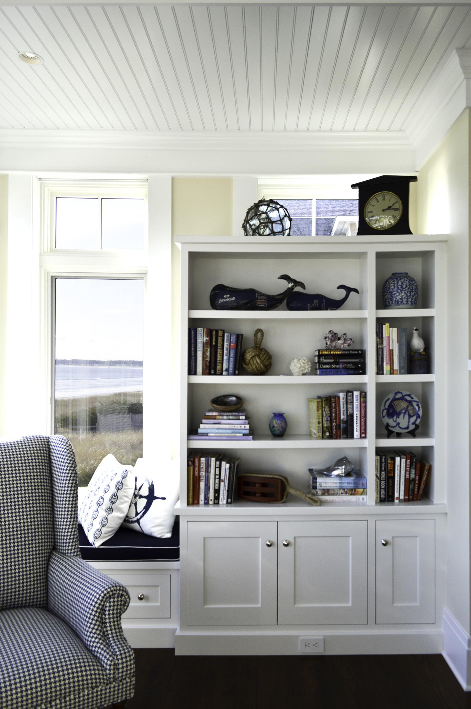Livingroom bookcase at Pine Point, Custom Home Construction in Southern Maine